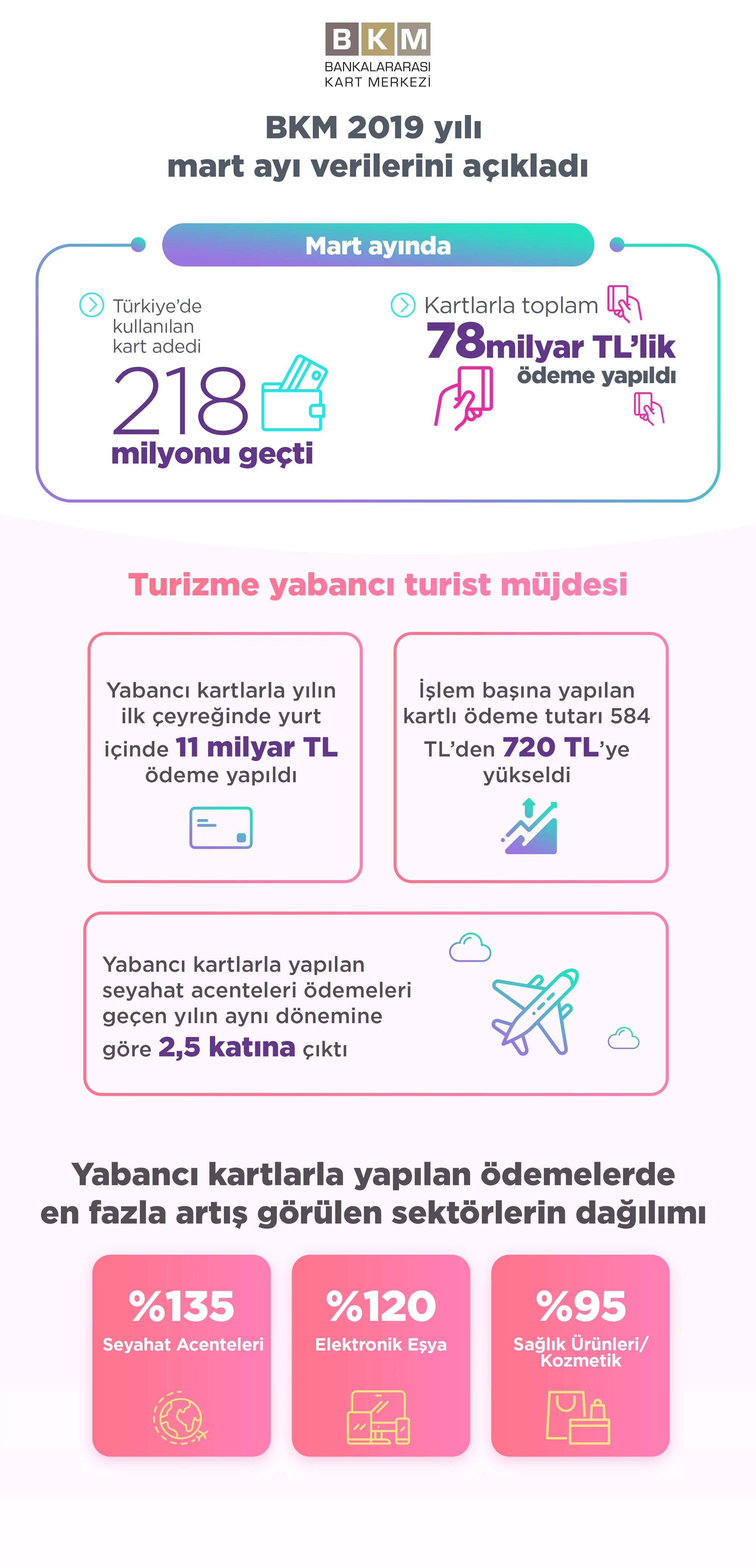 BKM verilerine göre Ocak-Mart ayları arasını kapsayan yılın ilk çeyreğinde yabancı kartlarla yurt içinde toplam 11 milyar TL tutarında ödeme yapıldı. Buna göre önceki yılın aynı döneminde 6 milyar TL olan kartlı ödeme tutarıyla kıyaslandığında, yüzde 85 büyümeyle son yıllardaki en büyük artışın gerçekleştiği görüldü. İşlem başına yapılan kartlı ödeme tutarı ise 584 TL’den 720 TL’ye çıktı.