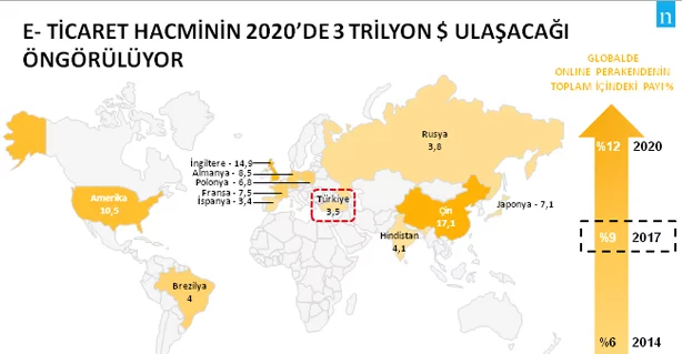 Nielsen Perakende Hizmetleri Lideri Tamer Gülsaç, “Global ölçekte toplam perakendenin %9’unu yapmakta olan e-ticaretin, 2020’de bu ağırlığını %12’ye çıkaracağı öngörülüyor. Hızlı tüketim ürünlerinin de içinde yer aldığı Türkiye perakende pazarında e-ticaret payı global ortalamanın altında. E-ticaret açısından Türkiye, ekonomik olarak da paralellikler gösterdiği Rusya ve Brezilya ile benzer bir yapıya sahip. TÜBİSAD verilerine göre 2017 yılında Türkiye’de online perakendenin toplam perakende içindeki payı %4,1 olarak gerçekleşti. Öte yandan bu alanda Çin, ABD ve İngiltere başı çekiyor.” dedi.