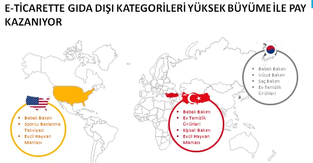 Nielsen Müşteri Hizmetleri Direktörü Yankı Yalçın, bebek bakım ürünleri, ev temizlik ürünleri, kişisel bakım ürünleri ve evcil hayvan ürünlerinin online kanalda ön plana çıkmasını beklediklerini söyledi. Yalçın “Üstelik bu, sadece Türkiye’ye özgü bir durum da değil. Online alışverişin ciddi bir paya ulaştığı Güney Kore’ye bakılacak olursa orada da bebek bakım ürünleri, deterjan gibi kategorilerin öne çıktığı görülüyor. ABD’de de yine bebek ürünleri, evcil hayvan ürünleri, sporcu beslenme takviyeleri gibi kategorilerin ilk sıralarda yer aldığı göze çarpıyor. Hem global tüketicisi hem de Türk tüketicisi için gıda kategorilerinde ilk seçenek online kanal değil. Özellikle taze gıdada, mağaza içinde yaşanan deneyim, önemini korumaya devam ediyor.” şeklinde konuştu.
